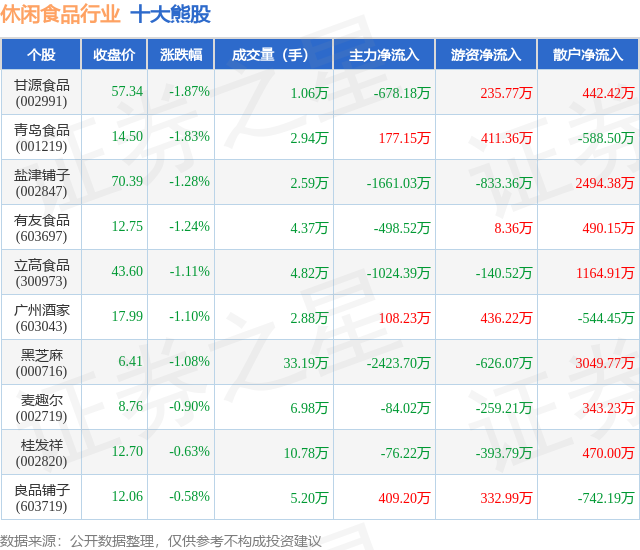 个股表现方面,休闲食品行业当日领跌股为甘源食品(002991),该股当日报收57.34,下跌1.87%,成交量1.06万,主力资金净流出678.18万元。青岛食品(001219)以下跌1.83%紧随其后,该股当日成交量2.94万,主力资金净流入177.15万元。除此之外,盐津铺子(002847)、有友食品(603697)、立高食品(300973)均进入当日熊股之列。具体个股列表见下表: