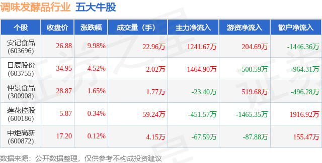 个股表现方面,调味发酵品行业当日领涨股为安记食品(603696),该股当日报收26.88,上涨9.98%,成交量22.96万,主力资金净流入1241.67万元。日辰股份(603755)以上涨4.52%紧随其后,该股当日成交量2.02万,主力资金净流入1464.9万元。除此之外,仲景食品(300908)、莲花控股(600186)、中炬高新(600872)均进入当日牛股之列。具体个股列表见下表: