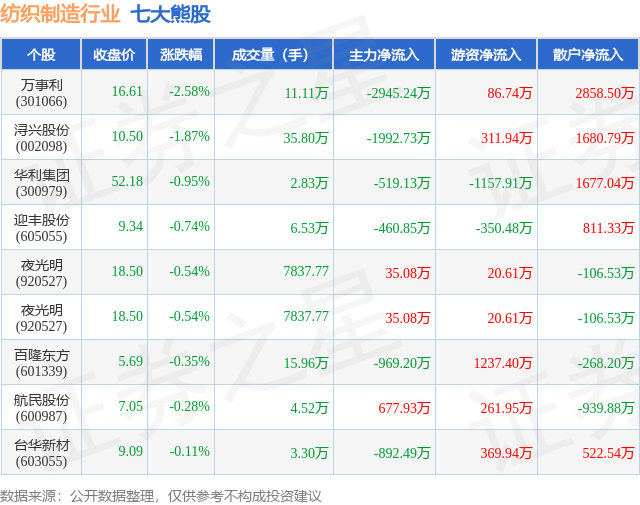 个股表现方面,纺织制造行业当日领跌股为万事利(301066),该股当日报收16.61,下跌2.58%,成交量11.11万,主力资金净流出2945.24万元。浔兴股份(002098)以下跌1.87%紧随其后,该股当日成交量35.8万,主力资金净流出1992.73万元。除此之外,华利集团(300979)、迎丰股份(605055)、夜光明(920527)均进入当日熊股之列。具体个股列表见下表: