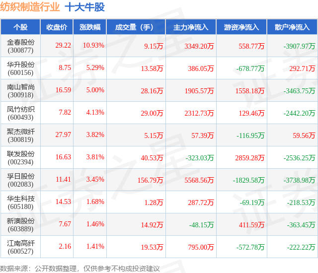 个股表现方面,纺织制造行业当日领涨股为金春股份(300877),该股当日报收29.22,上涨10.93%,成交量9.15万,主力资金净流入3349.2万元。华升股份(600156)以上涨5.29%紧随其后,该股当日成交量13.58万,主力资金净流入386.05万元。除此之外,南山智尚(300918)、凤竹纺织(600493)、聚杰微纤(300819)均进入当日牛股之列。具体个股列表见下表: