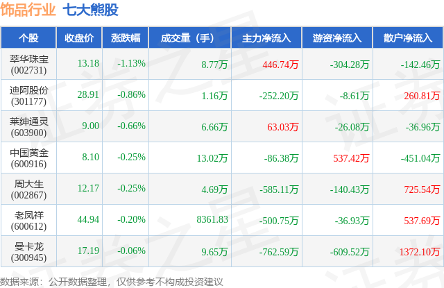 个股表现方面,饰品行业当日领跌股为萃华珠宝(002731),该股当日报收13.18,下跌1.13%,成交量8.77万,主力资金净流入446.74万元。迪阿股份(301177)以下跌0.86%紧随其后,该股当日成交量1.16万,主力资金净流出252.2万元。除此之外,莱绅通灵(603900)、中国黄金(600916)、周大生(002867)均进入当日熊股之列。具体个股列表见下表: