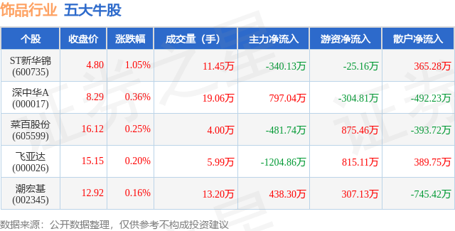 个股表现方面,饰品行业当日领涨股为ST新华锦(600735),该股当日报收4.8,上涨1.05%,成交量11.45万,主力资金净流出340.13万元。深中华A(000017)以上涨0.36%紧随其后,该股当日成交量19.06万,主力资金净流入797.04万元。除此之外,菜百股份(605599)、飞亚达(000026)、潮宏基(002345)均进入当日牛股之列。具体个股列表见下表: