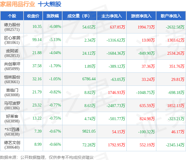 个股表现方面,家居用品行业当日领跌股为德力股份(002571),该股当日报收10.35,下跌6.08%,成交量54.65万,主力资金净流入637.85万元。匠心家居(301061)以下跌5.13%紧随其后,该股当日成交量2.34万,主力资金净流出1316.62万元。除此之外,皮阿诺(002853)、共创草坪(605099)、恒林股份(603661)均进入当日熊股之列。具体个股列表见下表: