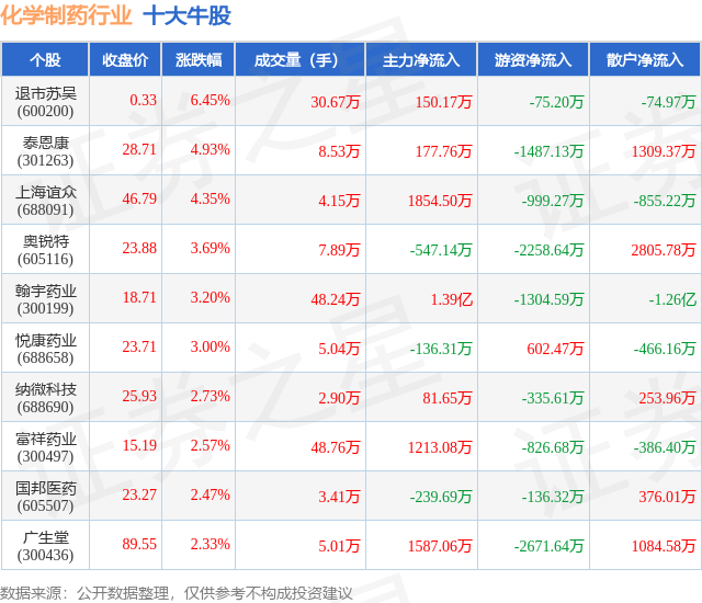 个股表现方面,化学制药行业当日领涨股为退市苏吴(600200),该股当日报收0.33,上涨6.45%,成交量30.67万,主力资金净流入150.17万元。泰恩康(301263)以上涨4.93%紧随其后,该股当日成交量8.53万,主力资金净流入177.76万元。除此之外,上海谊众(688091)、奥锐特(605116)、翰宇药业(300199)均进入当日牛股之列。具体个股列表见下表: