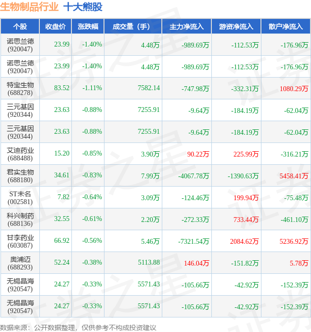 个股表现方面,生物制品行业当日领跌股为诺思兰德(920047),该股当日报收23.99,下跌1.4%,成交量4.48万,主力资金净流出989.69万元。诺思兰德(920047)以下跌1.4%紧随其后,该股当日成交量4.48万,主力资金净流出989.69万元。除此之外,特宝生物(688278)、三元基因(920344)、三元基因(920344)均进入当日熊股之列。具体个股列表见下表: