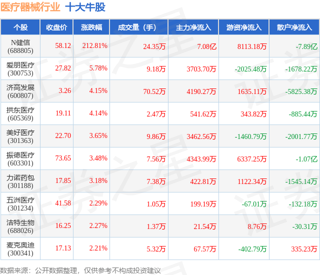 个股表现方面,医疗器械行业当日领涨股为N健信(688805),该股当日报收58.12,上涨212.81%,成交量24.35万,主力资金净流入7.08亿元。爱朋医疗(300753)以上涨5.78%紧随其后,该股当日成交量9.18万,主力资金净流入3703.7万元。除此之外,济高发展(600807)、拱东医疗(605369)、美好医疗(301363)均进入当日牛股之列。具体个股列表见下表: