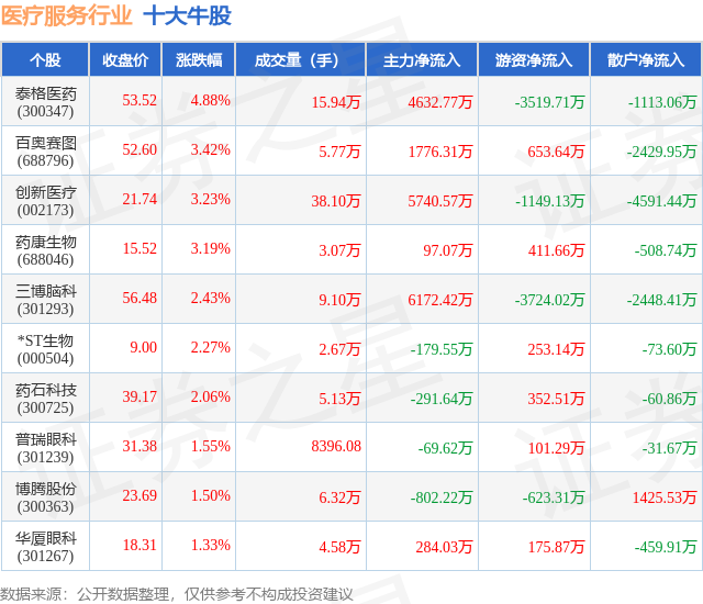 个股表现方面,医疗服务行业当日领涨股为泰格医药(300347),该股当日报收53.52,上涨4.88%,成交量15.94万,主力资金净流入4632.77万元。百奥赛图(688796)以上涨3.42%紧随其后,该股当日成交量5.77万,主力资金净流入1776.31万元。除此之外,创新医疗(002173)、药康生物(688046)、三博脑科(301293)均进入当日牛股之列。具体个股列表见下表: