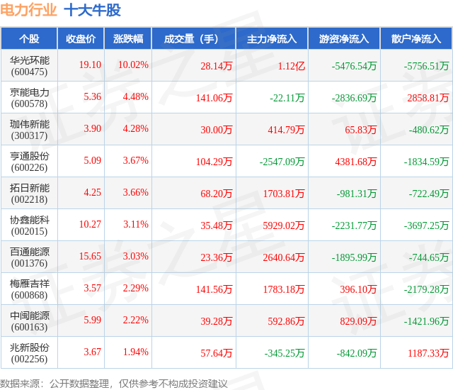 个股表现方面,电力行业当日领涨股为华光环能(600475),该股当日报收19.1,上涨10.02%,成交量28.14万,主力资金净流入1.12亿元。京能电力(600578)以上涨4.48%紧随其后,该股当日成交量141.06万,主力资金净流出22.11万元。除此之外,珈伟新能(300317)、亨通股份(600226)、拓日新能(002218)均进入当日牛股之列。具体个股列表见下表: