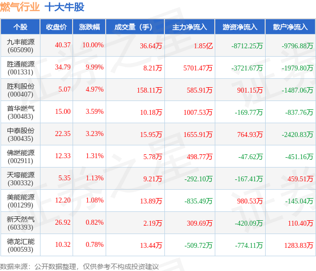 个股表现方面,燃气行业当日领涨股为九丰能源(605090),该股当日报收40.37,上涨10.0%,成交量36.64万,主力资金净流入1.85亿元。胜通能源(001331)以上涨9.99%紧随其后,该股当日成交量8.21万,主力资金净流入5701.47万元。除此之外,胜利股份(000407)、首华燃气(300483)、中泰股份(300435)均进入当日牛股之列。具体个股列表见下表: