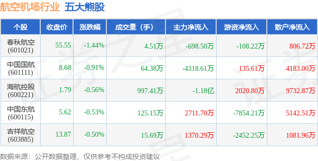 个股表现方面,航空机场行业当日领跌股为春秋航空(601021),该股当日报收55.55,下跌1.44%,成交量4.51万,主力资金净流出698.5万元。中国国航(601111)以下跌0.91%紧随其后,该股当日成交量64.38万,主力资金净流出4318.61万元。除此之外,海航控股(600221)、中国东航(600115)、吉祥航空(603885)均进入当日熊股之列。具体个股列表见下表: