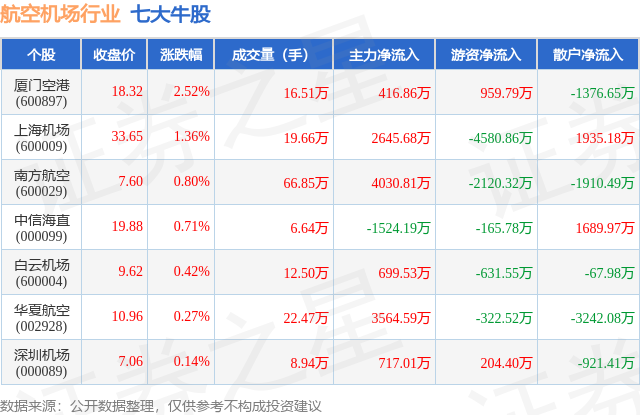 个股表现方面,航空机场行业当日领涨股为厦门空港(600897),该股当日报收18.32,上涨2.52%,成交量16.51万,主力资金净流入416.86万元。上海机场(600009)以上涨1.36%紧随其后,该股当日成交量19.66万,主力资金净流入2645.68万元。除此之外,南方航空(600029)、中信海直(000099)、白云机场(600004)均进入当日牛股之列。具体个股列表见下表: