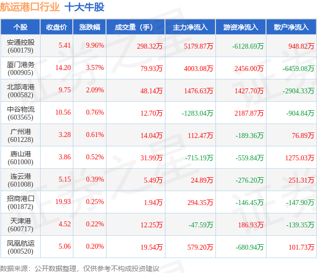个股表现方面,航运港口行业当日领涨股为安通控股(600179),该股当日报收5.41,上涨9.96%,成交量298.32万,主力资金净流入5179.87万元。厦门港务(000905)以上涨3.57%紧随其后,该股当日成交量79.93万,主力资金净流入4003.08万元。除此之外,北部湾港(000582)、中谷物流(603565)、广州港(601228)均进入当日牛股之列。具体个股列表见下表: