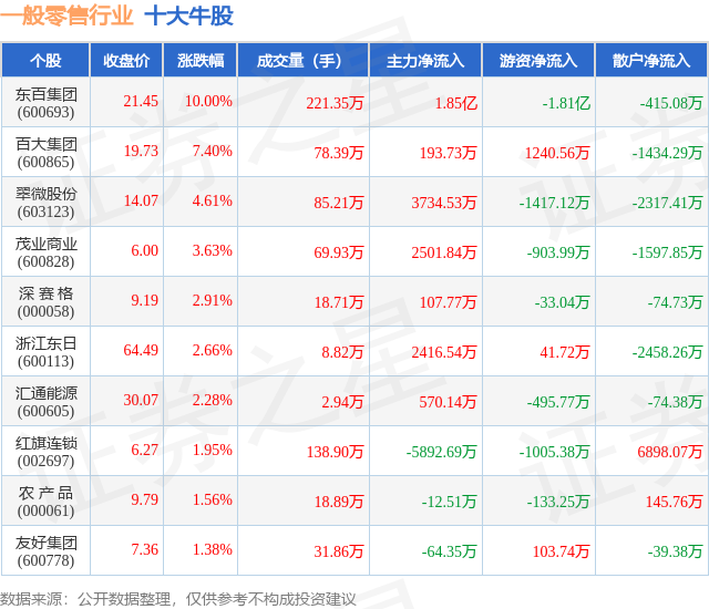 个股表现方面,一般零售行业当日领涨股为东百集团(600693),该股当日报收21.45,上涨10.0%,成交量221.35万,主力资金净流入1.85亿元。百大集团(600865)以上涨7.4%紧随其后,该股当日成交量78.39万,主力资金净流入193.73万元。除此之外,翠微股份(603123)、茂业商业(600828)、深 赛 格(000058)均进入当日牛股之列。具体个股列表见下表: