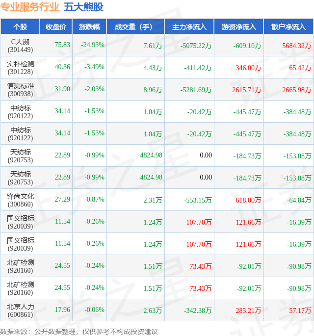 个股表现方面,专业服务行业当日领跌股为C天溯(301449),该股当日报收75.83,下跌24.93%,成交量7.61万,主力资金净流出5075.22万元。实朴检测(301228)以下跌3.49%紧随其后,该股当日成交量4.43万,主力资金净流出411.42万元。除此之外,信测标准(300938)、中纺标(920122)、中纺标(920122)均进入当日熊股之列。具体个股列表见下表: