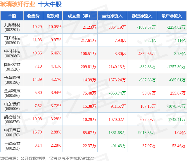 个股表现方面,玻璃玻纤行业当日领涨股为九鼎新材(002201),该股当日报收10.29,上涨10.05%,成交量21.23万,主力资金净流入3864.19万元。再升科技(603601)以上涨9.97%紧随其后,该股当日成交量217.61万,主力资金净流入7.93亿元。除此之外,中材科技(002080)、国际复材(301526)、长海股份(300196)均进入当日牛股之列。具体个股列表见下表: