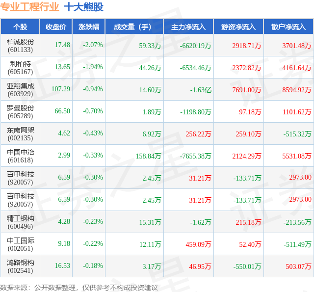 个股表现方面,专业工程行业当日领跌股为柏诚股份(601133),该股当日报收17.48,下跌2.07%,成交量59.33万,主力资金净流出6620.19万元。利柏特(605167)以下跌1.94%紧随其后,该股当日成交量44.26万,主力资金净流出6534.46万元。除此之外,亚翔集成(603929)、罗曼股份(605289)、东南网架(002135)均进入当日熊股之列。具体个股列表见下表: