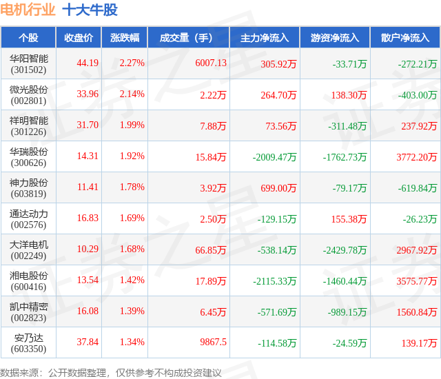 个股表现方面,电机行业当日领涨股为华阳智能(301502),该股当日报收44.19,上涨2.27%,成交量6007.0,主力资金净流入305.92万元。微光股份(002801)以上涨2.14%紧随其后,该股当日成交量2.22万,主力资金净流入264.7万元。除此之外,祥明智能(301226)、华瑞股份(300626)、神力股份(603819)均进入当日牛股之列。具体个股列表见下表: