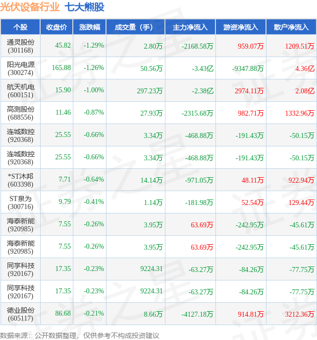 个股表现方面,光伏设备行业当日领跌股为通灵股份(301168),该股当日报收45.82,下跌1.29%,成交量2.8万,主力资金净流出2168.58万元。阳光电源(300274)以下跌1.26%紧随其后,该股当日成交量50.56万,主力资金净流出3.43亿元。除此之外,航天机电(600151)、高测股份(688556)、连城数控(920368)均进入当日熊股之列。具体个股列表见下表: