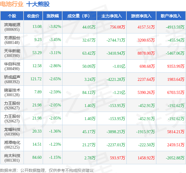 个股表现方面,电池行业当日领跌股为滨海能源(000695),该股当日报收13.08,下跌3.82%,成交量44.05万,主力资金净流入756.08万元。芳源股份(688148)以下跌3.45%紧随其后,该股当日成交量32.67万,主力资金净流出2744.71万元。除此之外,天华新能(300390)、华自科技(300490)、骄成超声(688392)均进入当日熊股之列。具体个股列表见下表: