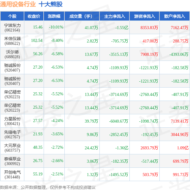 个股表现方面,通用设备行业当日领跌股为宁波东力(002164),该股当日报收15.46,下跌10.01%,成交量41.07万,主力资金净流出1.55亿元。禾信仪器(688622)以下跌8.4%紧随其后,该股当日成交量2.82万,主力资金净流出705.75万元。除此之外,沃尔德(688028)、驰诚股份(920407)、驰诚股份(920407)均进入当日熊股之列。具体个股列表见下表: