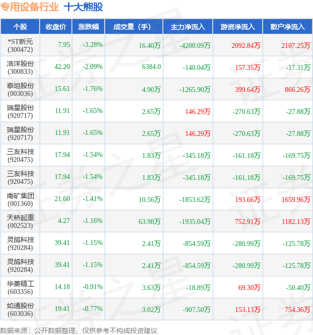 个股表现方面,专用设备行业当日领跌股为*ST新元(300472),该股当日报收7.95,下跌3.28%,成交量16.4万,主力资金净流出4200.09万元。浩洋股份(300833)以下跌2.09%紧随其后,该股当日成交量6384.0,主力资金净流出140.04万元。除此之外,泰坦股份(003036)、瑞星股份(920717)、瑞星股份(920717)均进入当日熊股之列。具体个股列表见下表: