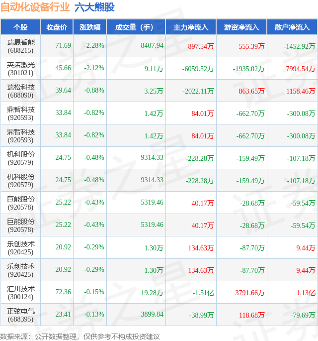 个股表现方面,自动化设备行业当日领跌股为瑞晟智能(688215),该股当日报收71.69,下跌2.28%,成交量8408.0,主力资金净流入897.54万元。英诺激光(301021)以下跌2.12%紧随其后,该股当日成交量9.11万,主力资金净流出6059.52万元。除此之外,瑞松科技(688090)、鼎智科技(920593)、鼎智科技(920593)均进入当日熊股之列。具体个股列表见下表: