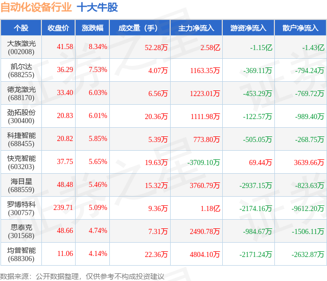 个股表现方面,自动化设备行业当日领涨股为大族激光(002008),该股当日报收41.58,上涨8.34%,成交量52.28万,主力资金净流入2.58亿元。凯尔达(688255)以上涨7.53%紧随其后,该股当日成交量4.07万,主力资金净流入1163.35万元。除此之外,德龙激光(688170)、劲拓股份(300400)、科捷智能(688455)均进入当日牛股之列。具体个股列表见下表: