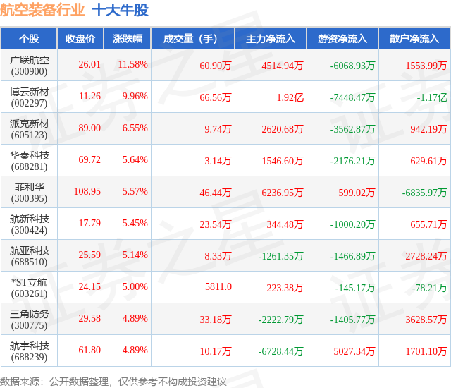 个股表现方面,航空装备行业当日领涨股为广联航空(300900),该股当日报收26.01,上涨11.58%,成交量60.9万,主力资金净流入4514.94万元。博云新材(002297)以上涨9.96%紧随其后,该股当日成交量66.56万,主力资金净流入1.92亿元。除此之外,派克新材(605123)、华秦科技(688281)、菲利华(300395)均进入当日牛股之列。具体个股列表见下表: