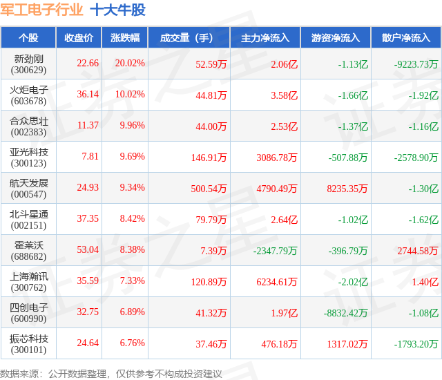 个股表现方面,军工电子行业当日领涨股为新劲刚(300629),该股当日报收22.66,上涨20.02%,成交量52.59万,主力资金净流入2.06亿元。火炬电子(603678)以上涨10.02%紧随其后,该股当日成交量44.81万,主力资金净流入3.58亿元。除此之外,合众思壮(002383)、亚光科技(300123)、航天发展(000547)均进入当日牛股之列。具体个股列表见下表: