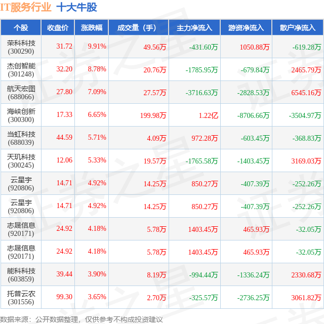 个股表现方面,IT服务行业当日领涨股为荣科科技(300290),该股当日报收31.72,上涨9.91%,成交量49.56万,主力资金净流出431.6万元。杰创智能(301248)以上涨8.78%紧随其后,该股当日成交量20.76万,主力资金净流出1785.95万元。除此之外,航天宏图(688066)、海峡创新(300300)、当虹科技(688039)均进入当日牛股之列。具体个股列表见下表: