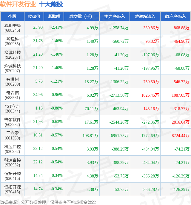 个股表现方面,软件开发行业当日领跌股为嘉和美康(688246),该股当日报收23.9,下跌2.41%,成交量4.99万,主力资金净流出1258.74万元。盈建科(300935)以下跌1.46%紧随其后,该股当日成交量1.4万,主力资金净流出560.72万元。除此之外,众诚科技(920207)、众诚科技(920207)、有棵树(300209)均进入当日熊股之列。具体个股列表见下表: