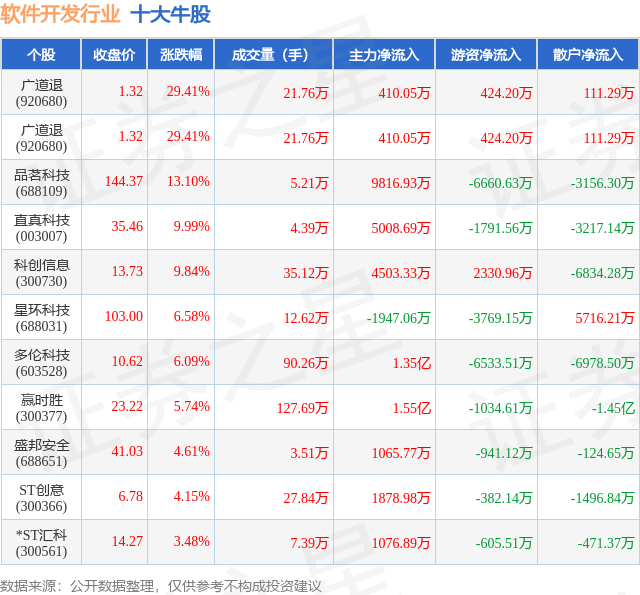 个股表现方面,软件开发行业当日领涨股为广道退(920680),该股当日报收1.32,上涨29.41%,成交量21.76万,主力资金净流入410.05万元。广道退(920680)以上涨29.41%紧随其后,该股当日成交量21.76万,主力资金净流入410.05万元。除此之外,品茗科技(688109)、直真科技(003007)、科创信息(300730)均进入当日牛股之列。具体个股列表见下表: