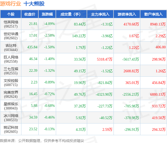 个股表现方面,游戏行业当日领跌股为恺英网络(002517),该股当日报收21.81,下跌4.09%,成交量83.44万,主力资金净流出1.31亿元。世纪华通(002602)以下跌2.58%紧随其后,该股当日成交量149.22万,主力资金净流出3.96亿元。除此之外,吉比特(603444)、巨人网络(002558)、三七互娱(002555)均进入当日熊股之列。具体个股列表见下表: