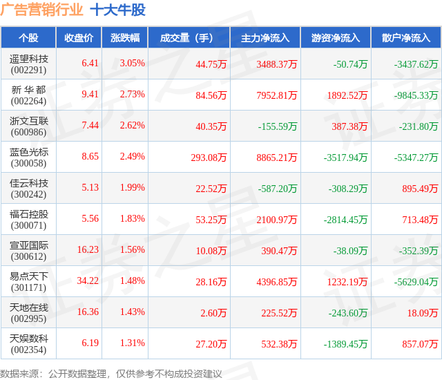 个股表现方面,广告营销行业当日领涨股为遥望科技(002291),该股当日报收6.41,上涨3.05%,成交量44.75万,主力资金净流入3488.37万元。新 华 都(002264)以上涨2.73%紧随其后,该股当日成交量84.56万,主力资金净流入7952.81万元。除此之外,浙文互联(600986)、蓝色光标(300058)、佳云科技(300242)均进入当日牛股之列。具体个股列表见下表: