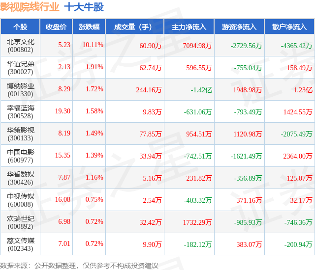 个股表现方面,影视院线行业当日领涨股为北京文化(000802),该股当日报收5.23,上涨10.11%,成交量60.9万,主力资金净流入7094.98万元。华谊兄弟(300027)以上涨1.91%紧随其后,该股当日成交量62.74万,主力资金净流入596.55万元。除此之外,博纳影业(001330)、幸福蓝海(300528)、华策影视(300133)均进入当日牛股之列。具体个股列表见下表: