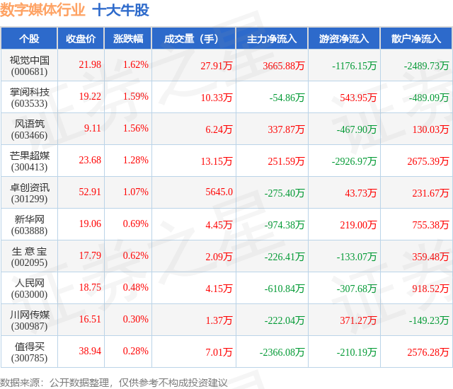 个股表现方面,数字媒体行业当日领涨股为视觉中国(000681),该股当日报收21.98,上涨1.62%,成交量27.91万,主力资金净流入3665.88万元。掌阅科技(603533)以上涨1.59%紧随其后,该股当日成交量10.33万,主力资金净流出54.86万元。除此之外,风语筑(603466)、芒果超媒(300413)、卓创资讯(301299)均进入当日牛股之列。具体个股列表见下表: