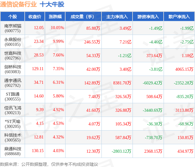 个股表现方面,通信设备行业当日领涨股为南京熊猫(600775),该股当日报收12.05,上涨10.05%,成交量85.88万,主力资金净流入3.49亿元。永鼎股份(600105)以上涨9.99%紧随其后,该股当日成交量246.55万,主力资金净流入7.21亿元。除此之外,世嘉科技(002796)、剑桥科技(603083)、通宇通讯(002792)均进入当日牛股之列。具体个股列表见下表: