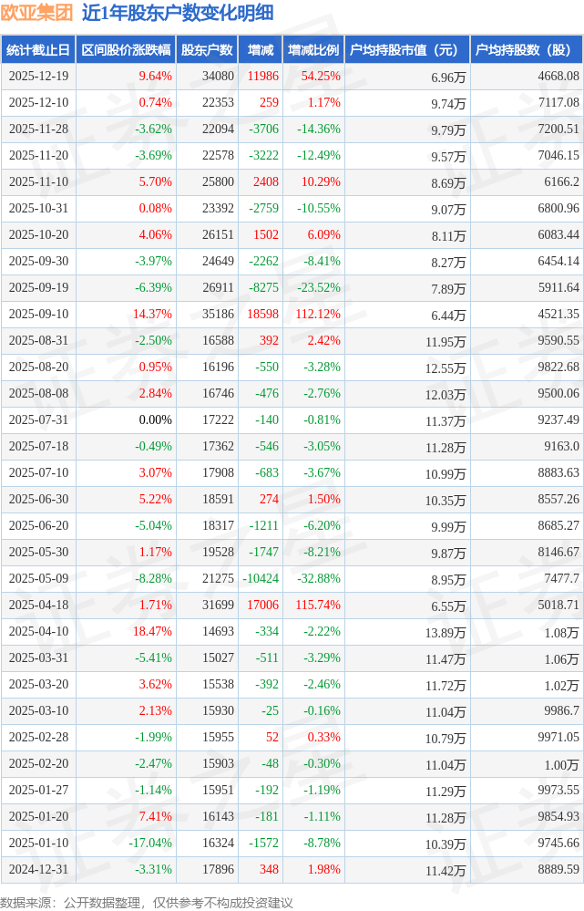 从股价来看,2025年11月28日至2025年12月19日,欧亚集团区间涨幅为9.64%,在此期间股东户数增加1.2万户,增幅为54.25%。