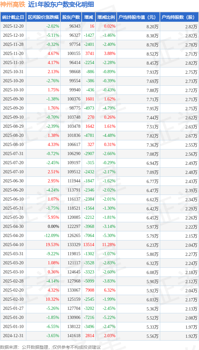 从股价来看,2025年12月10日至2025年12月20日,神州高铁区间跌幅为2.02%,在此期间股东户数增加16.0户,增幅为0.02%。