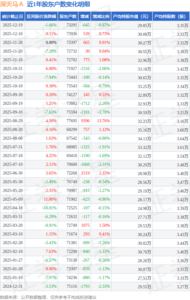 从股价来看,2025年12月10日至2025年12月19日,深天马A区间跌幅为1.66%,在此期间股东户数减少645.0户,减幅为0.87%。