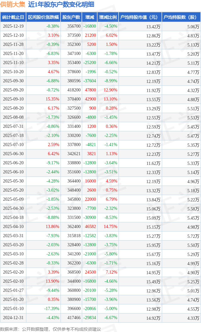 从股价来看,2025年12月10日至2025年12月19日,供销大集区间跌幅为0.38%,在此期间股东户数减少1.68万户,减幅为4.5%。