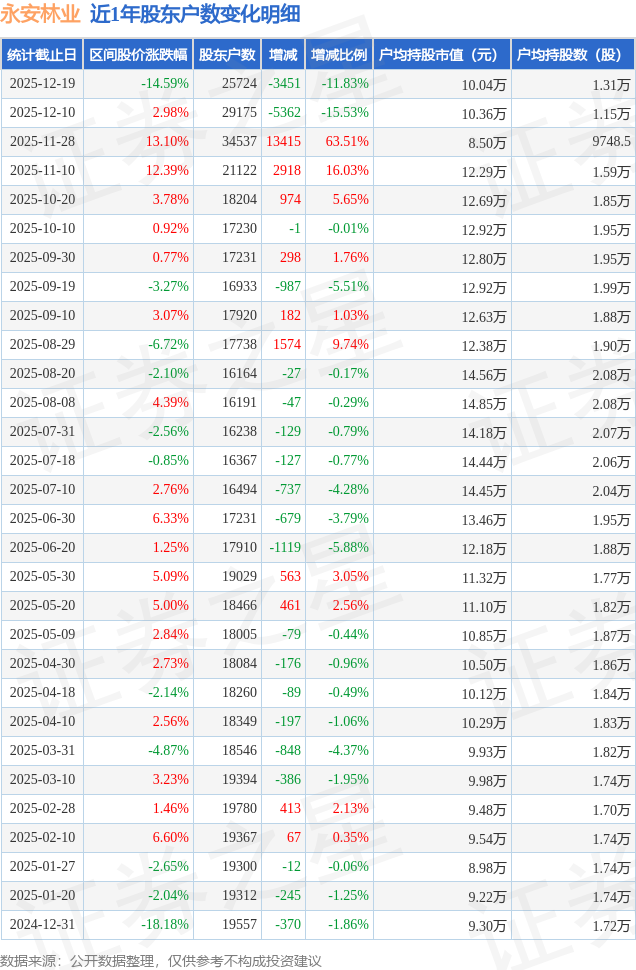 从股价来看,2025年12月10日至2025年12月19日,永安林业区间跌幅为14.59%,在此期间股东户数减少3451.0户,减幅为11.83%。