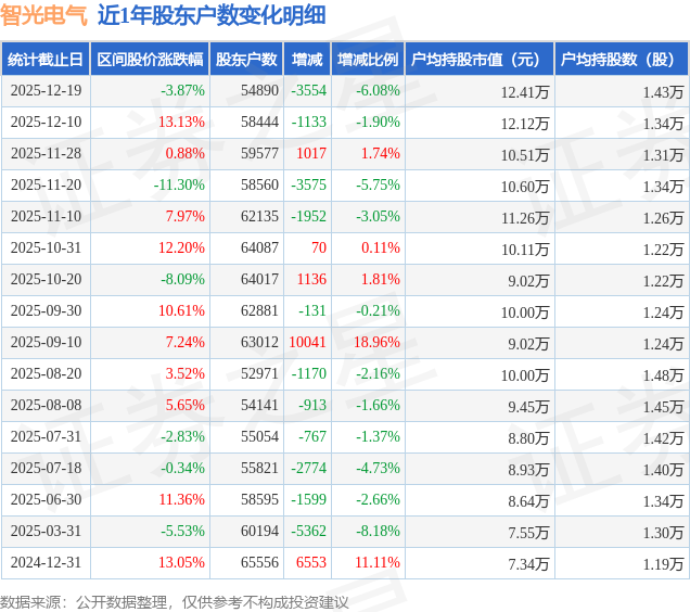 从股价来看,2025年12月10日至2025年12月19日,智光电气区间跌幅为3.87%,在此期间股东户数减少3554.0户,减幅为6.08%。