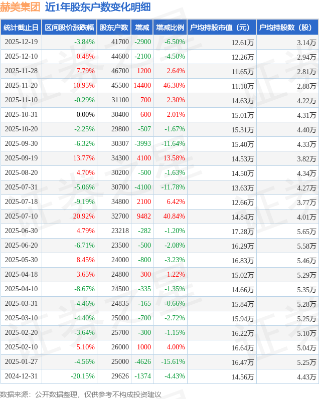 从股价来看,2025年12月10日至2025年12月19日,赫美集团区间跌幅为3.84%,在此期间股东户数减少2900.0户,减幅为6.5%。