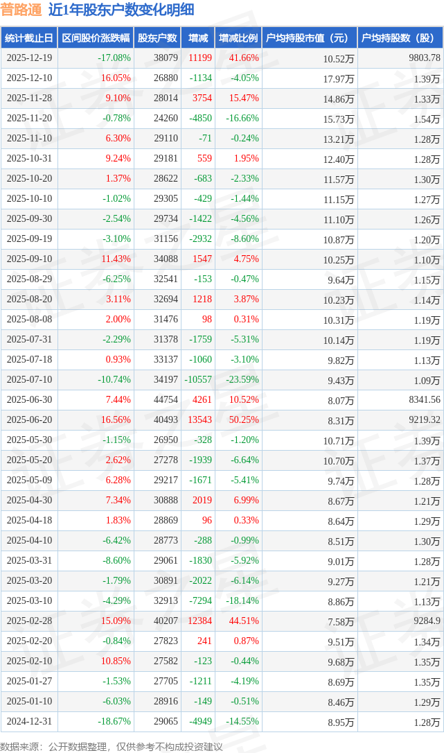 从股价来看,2025年12月10日至2025年12月19日,普路通区间跌幅为17.08%,在此期间股东户数增加1.12万户,增幅为41.66%。