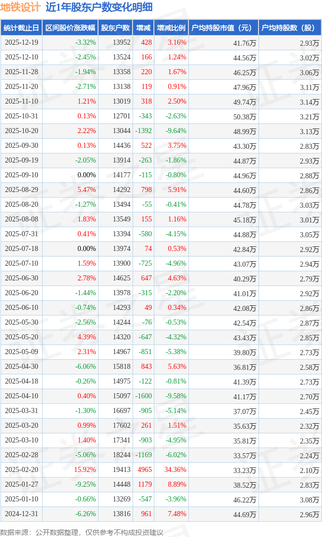 从股价来看,2025年12月10日至2025年12月19日,地铁设计区间跌幅为3.32%,在此期间股东户数增加428.0户,增幅为3.16%。