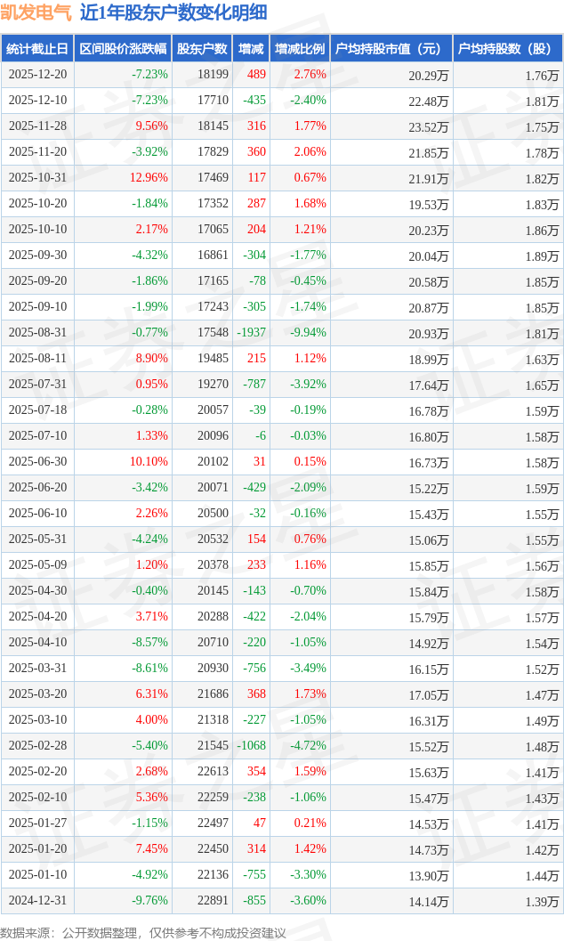从股价来看,2025年12月10日至2025年12月20日,凯发电气区间跌幅为7.23%,在此期间股东户数增加489.0户,增幅为2.76%。