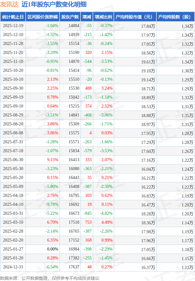 从股价来看,2025年12月10日至2025年12月19日,友讯达区间跌幅为1.04%,在此期间股东户数减少55.0户,减幅为0.37%。