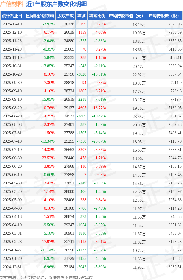 从股价来看,2025年12月10日至2025年12月19日,广信材料区间跌幅为3.93%,在此期间股东户数增加199.0户,增幅为0.76%。
