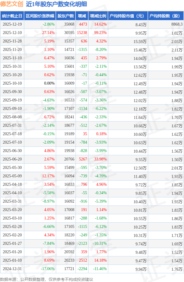 从股价来看,2025年12月10日至2025年12月19日,德艺文创区间跌幅为2.86%,在此期间股东户数增加4473.0户,增幅为14.62%。